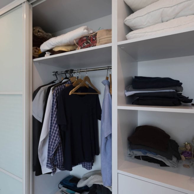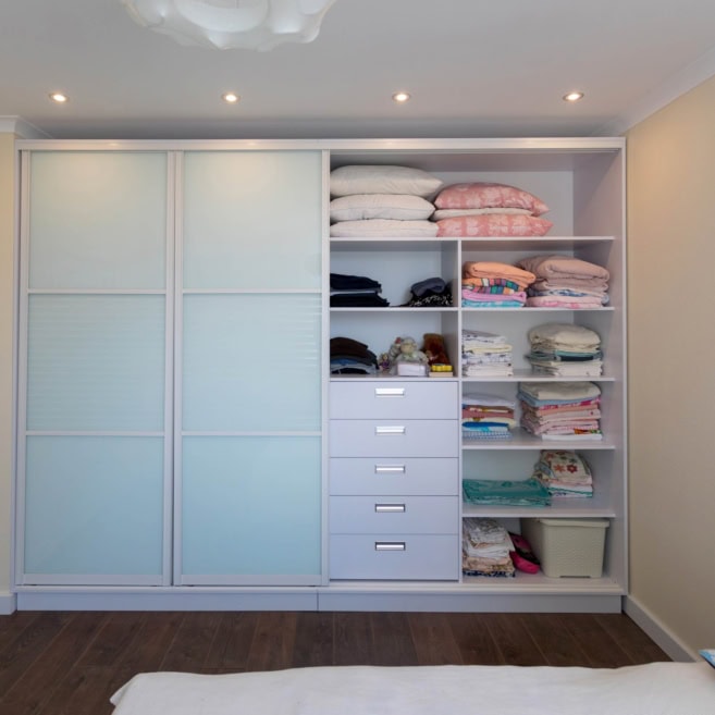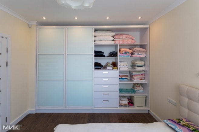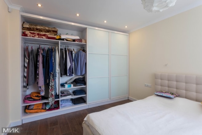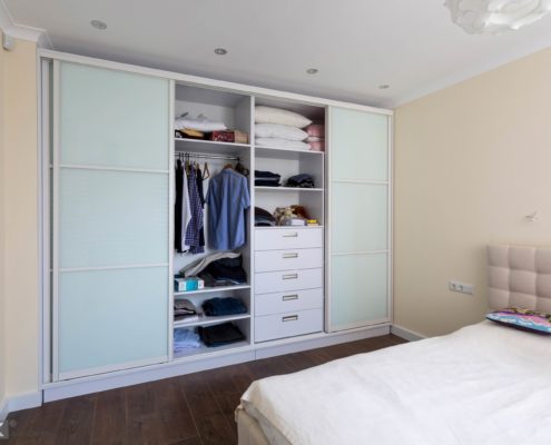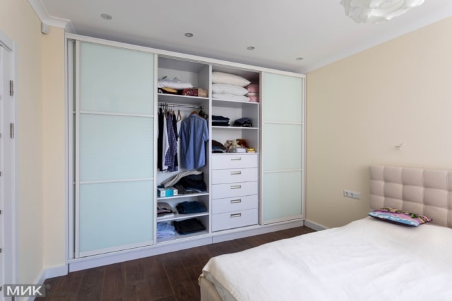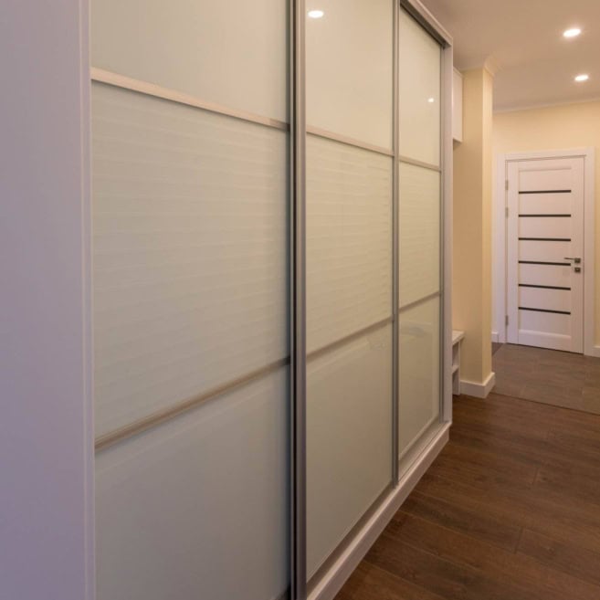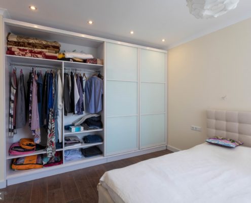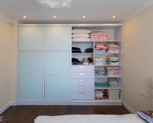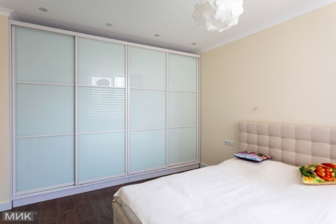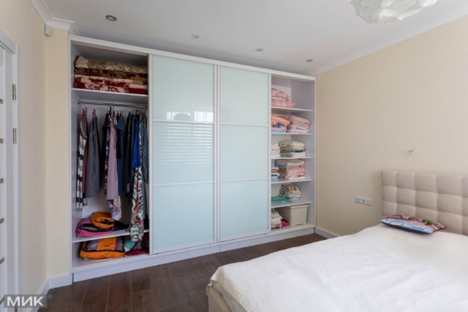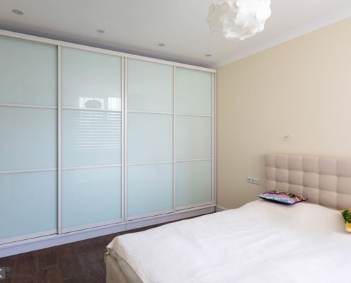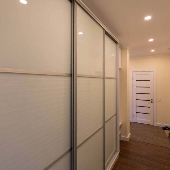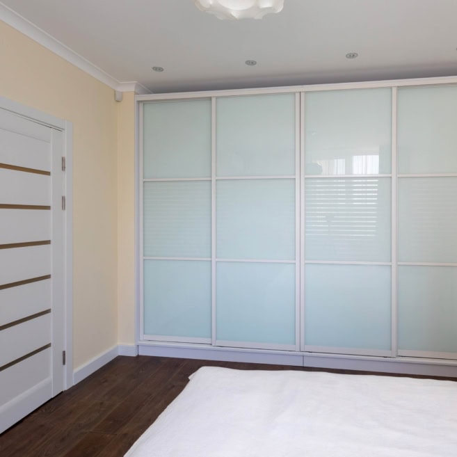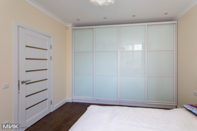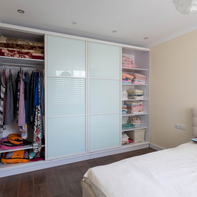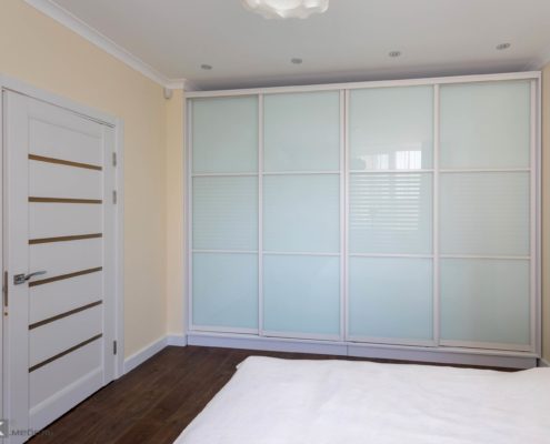 Чотиридверна шафа купе змонтована в нішу спальної кімнати, виконана у світлих тонах, що надає приміщенню легкості та простору. Розсувна система з потужного алюмінієвого профілю преміум-серії, пофарбованого в білий колір. Двері шафи з матовим склом забезпечують ніжний візуальний ефект і приховують вміст, зберігаючи водночас відчуття відкритості та легкості. Чотиридверна шафа купе, дуже зручне рішення, з великою кількістю варіацій відкривання, можете звернути увагу на фото!