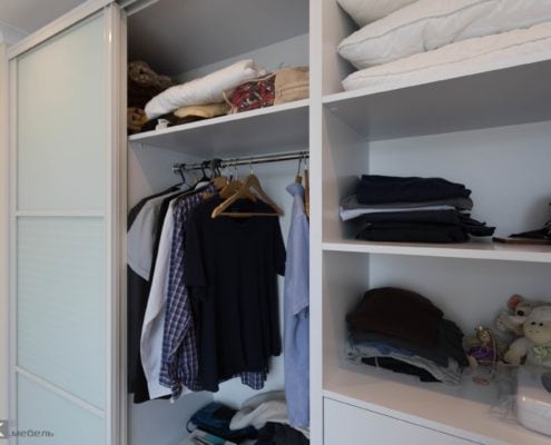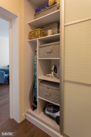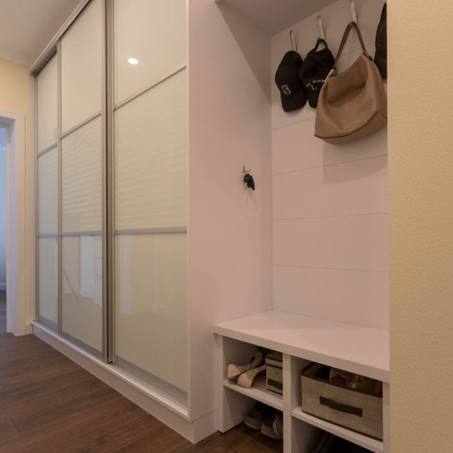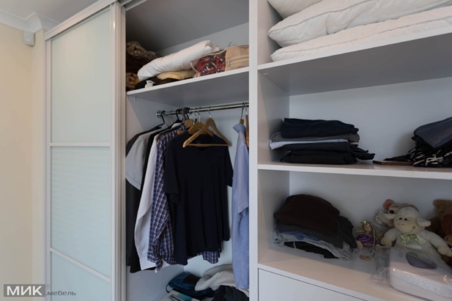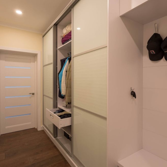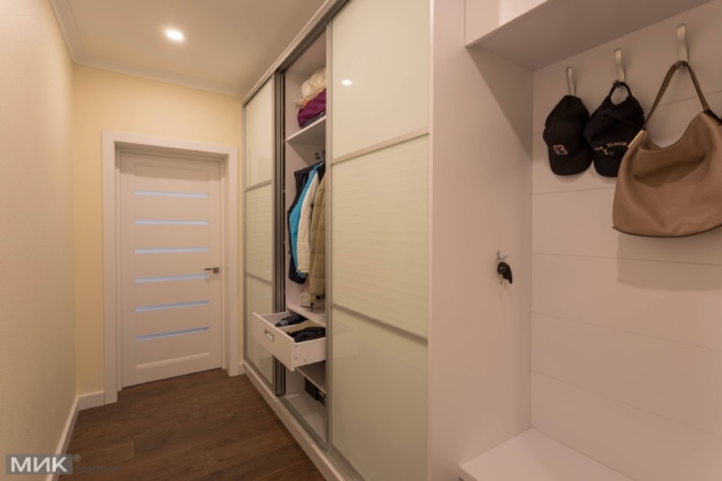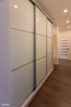 Трьохдверна шафа купе змонтована в коридорі багатокімнатної квартири. Збоку шафи передбачена відкрита вішалка для головних уборів і верхнього одягу, відкриті полиці для речей і взуття і підвісна антресоль.
