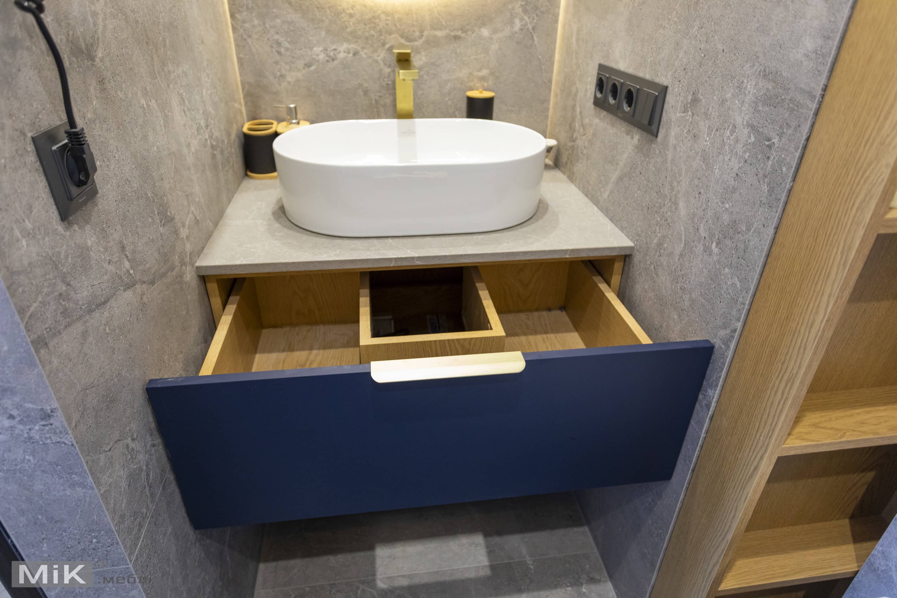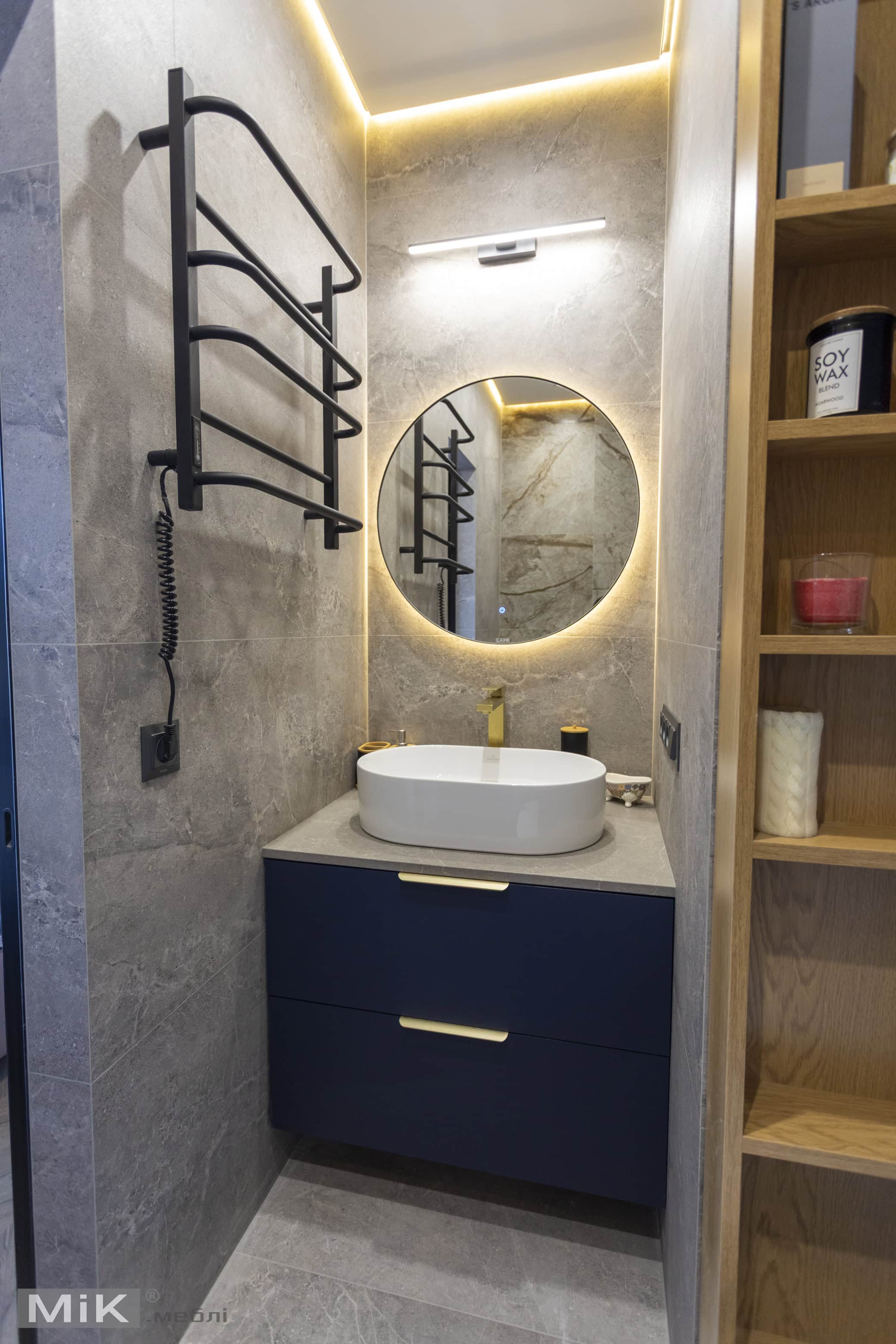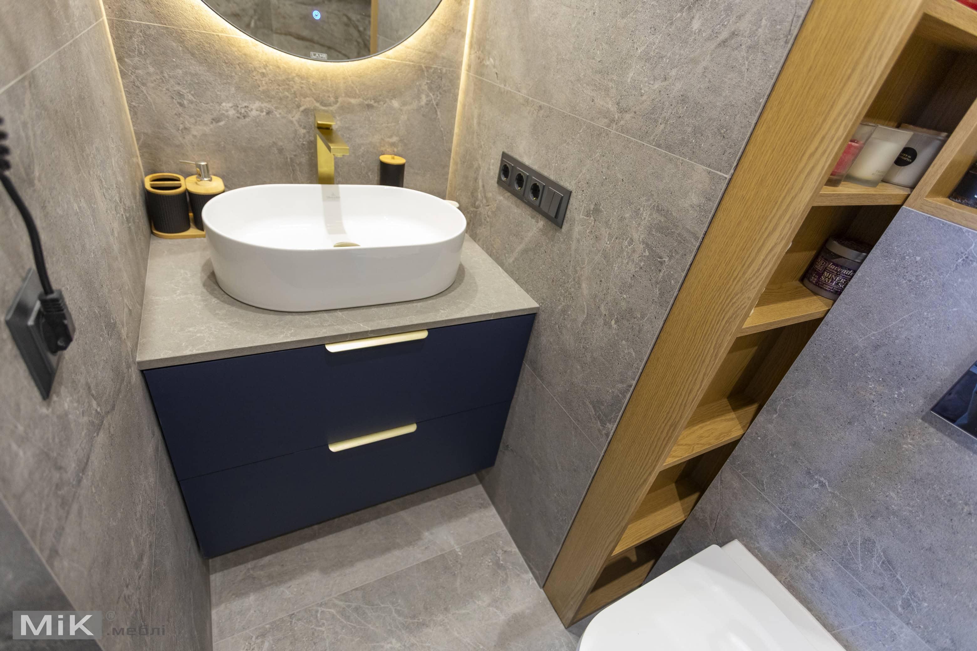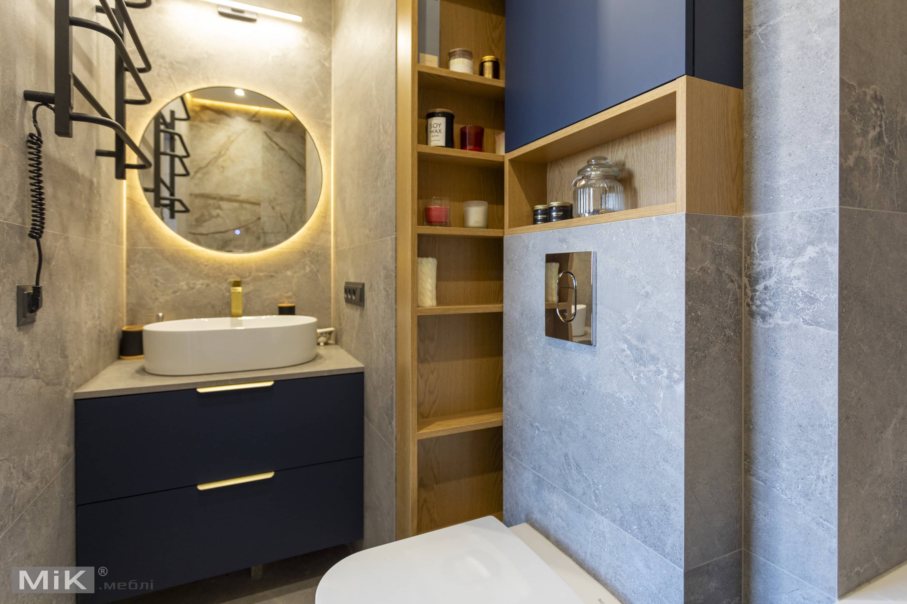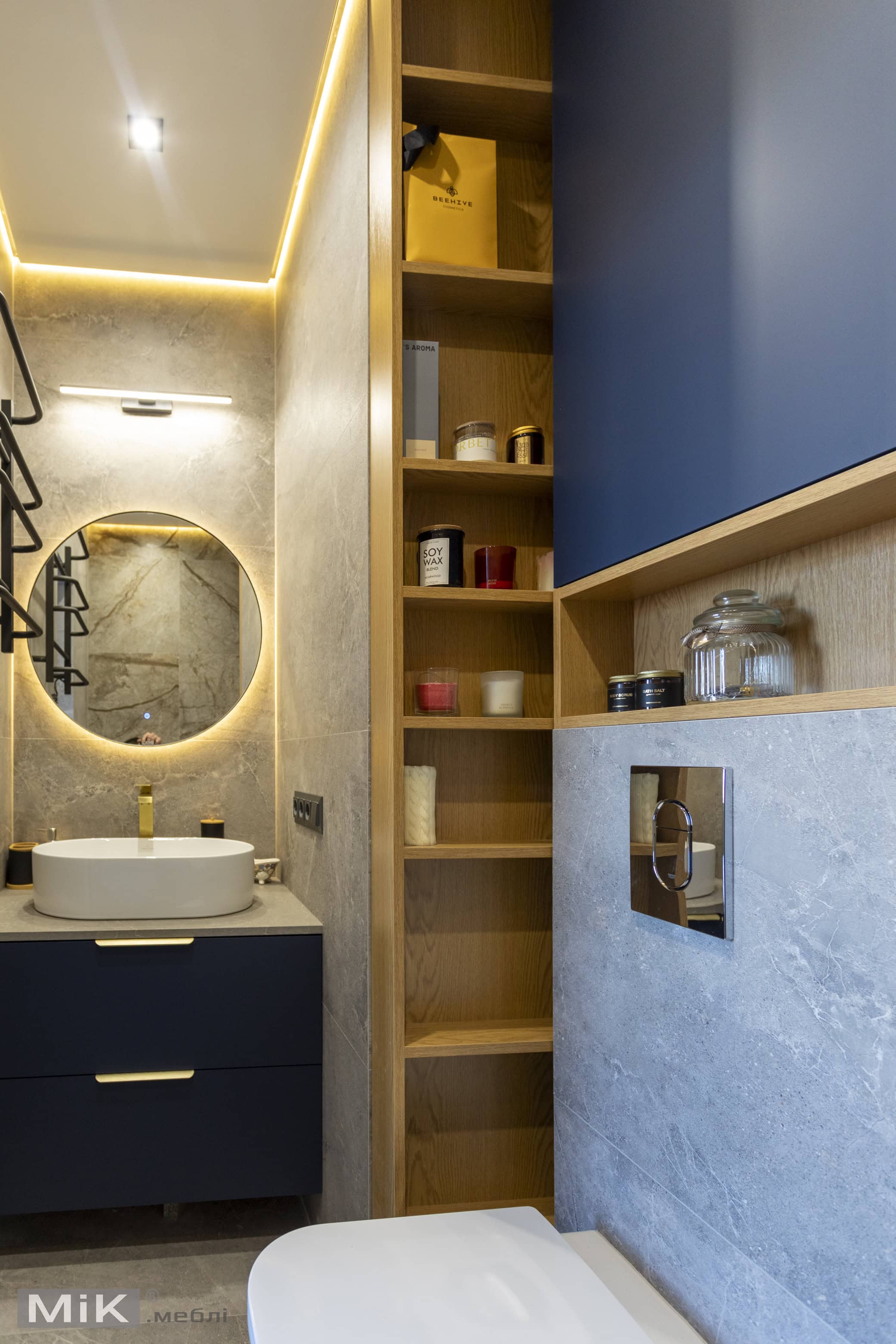 Для першого санвузла ми виготовили підвісну тумбу в глибокому синьому кольорі, кругле дзеркало та відкриті полиці з підсвіткою. Таке рішення допомогло поєднати практичне зберігання, зручну умивальну зону та виразний сучасний акцент в інтер’єрі.
