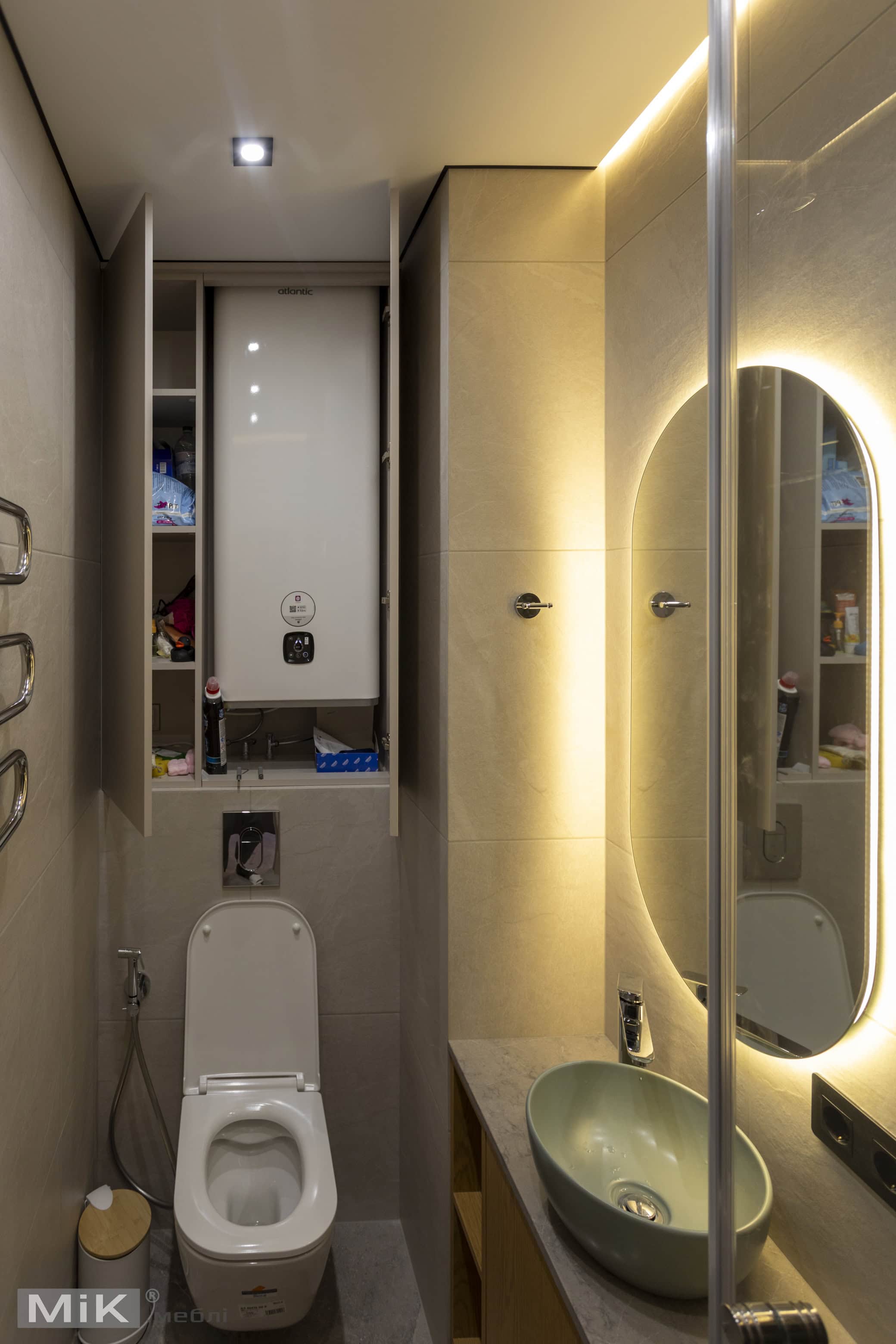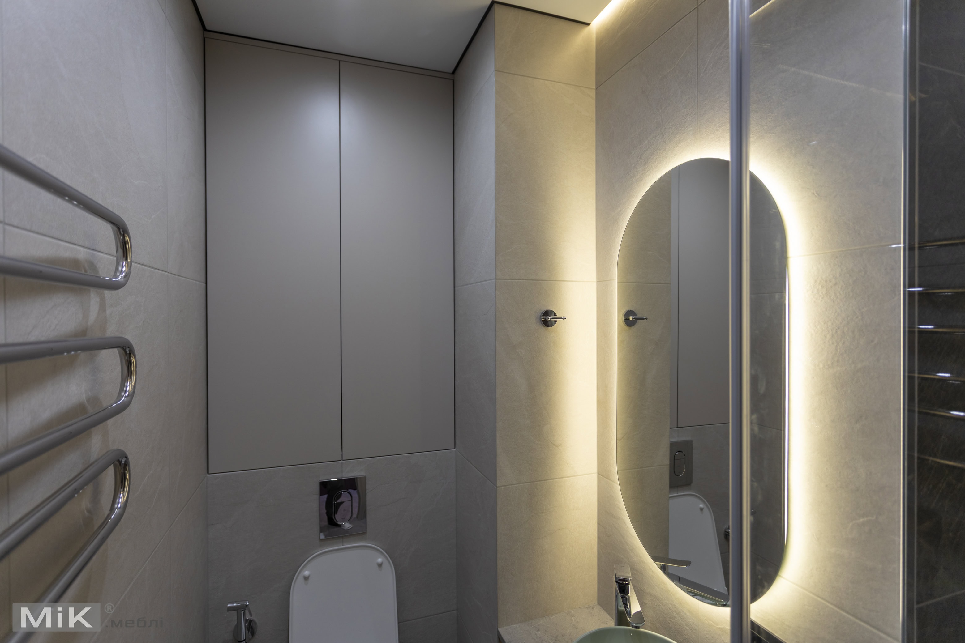 Для другого санвузла ми виготовили вузьку тумбу з умивальником і високі фасади для акуратного зберігання. Підсвітка, лаконічні форми та світла кольорова гама допомогли зробити простір візуально легким і зручним у щоденному користуванні.