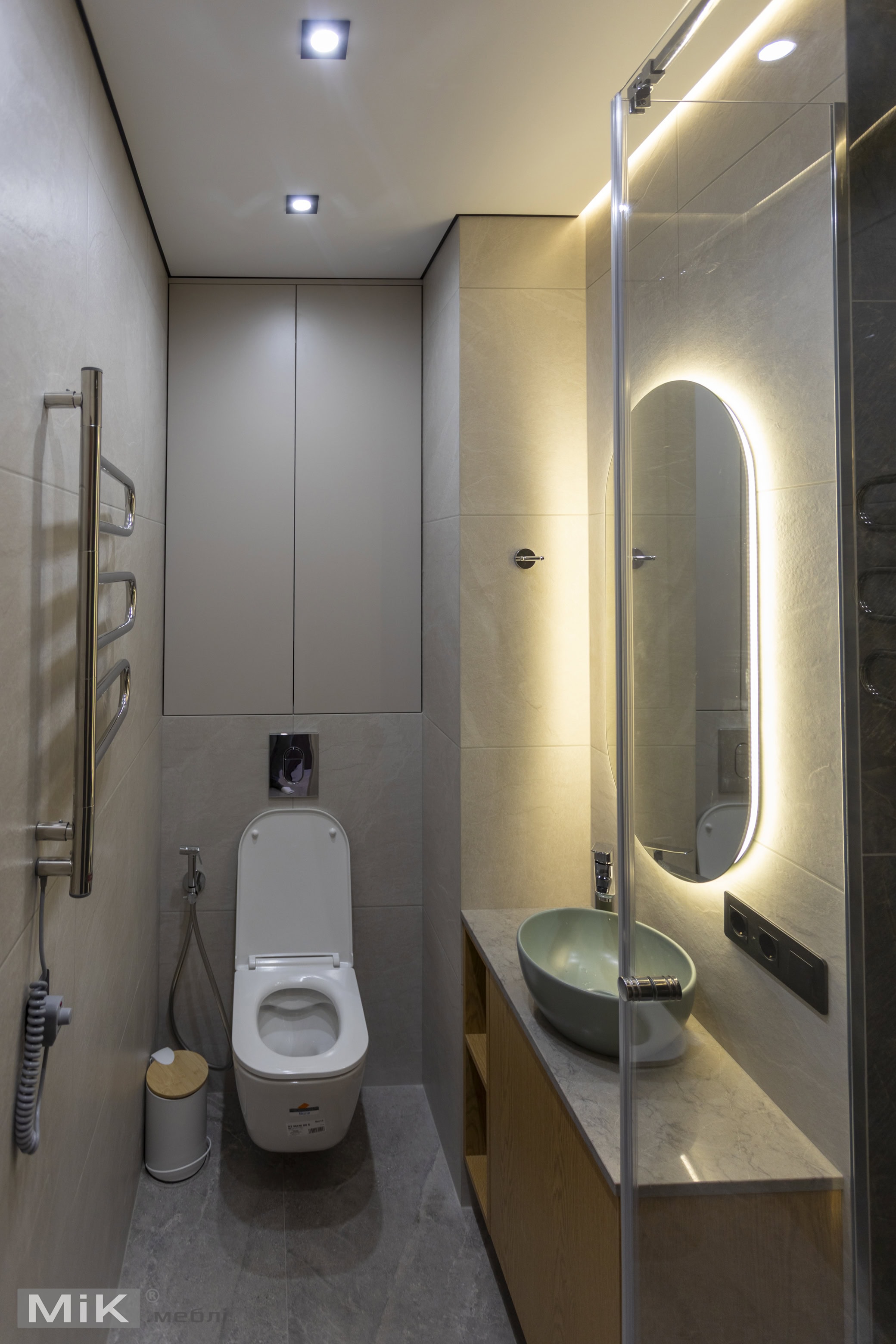 Компактний санвузол із вузькою тумбою та високими фасадами