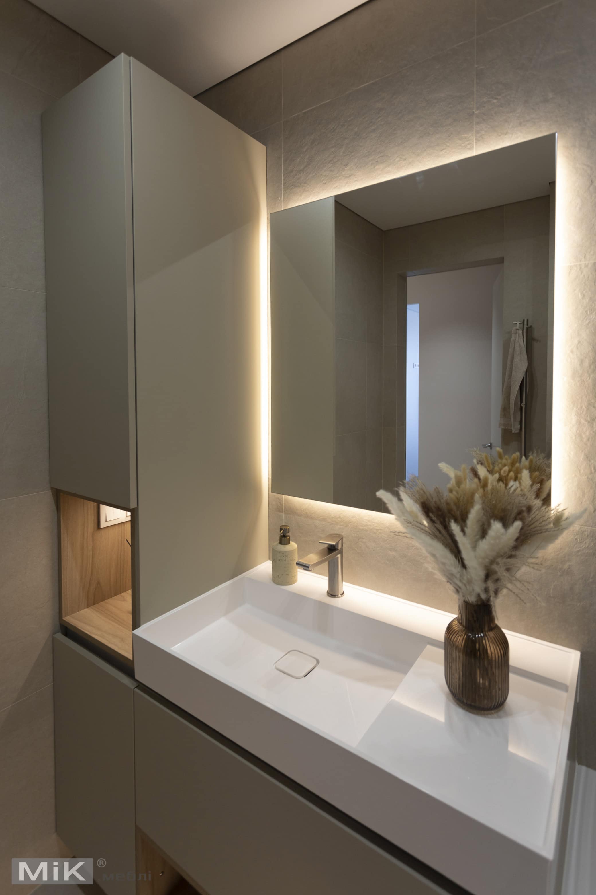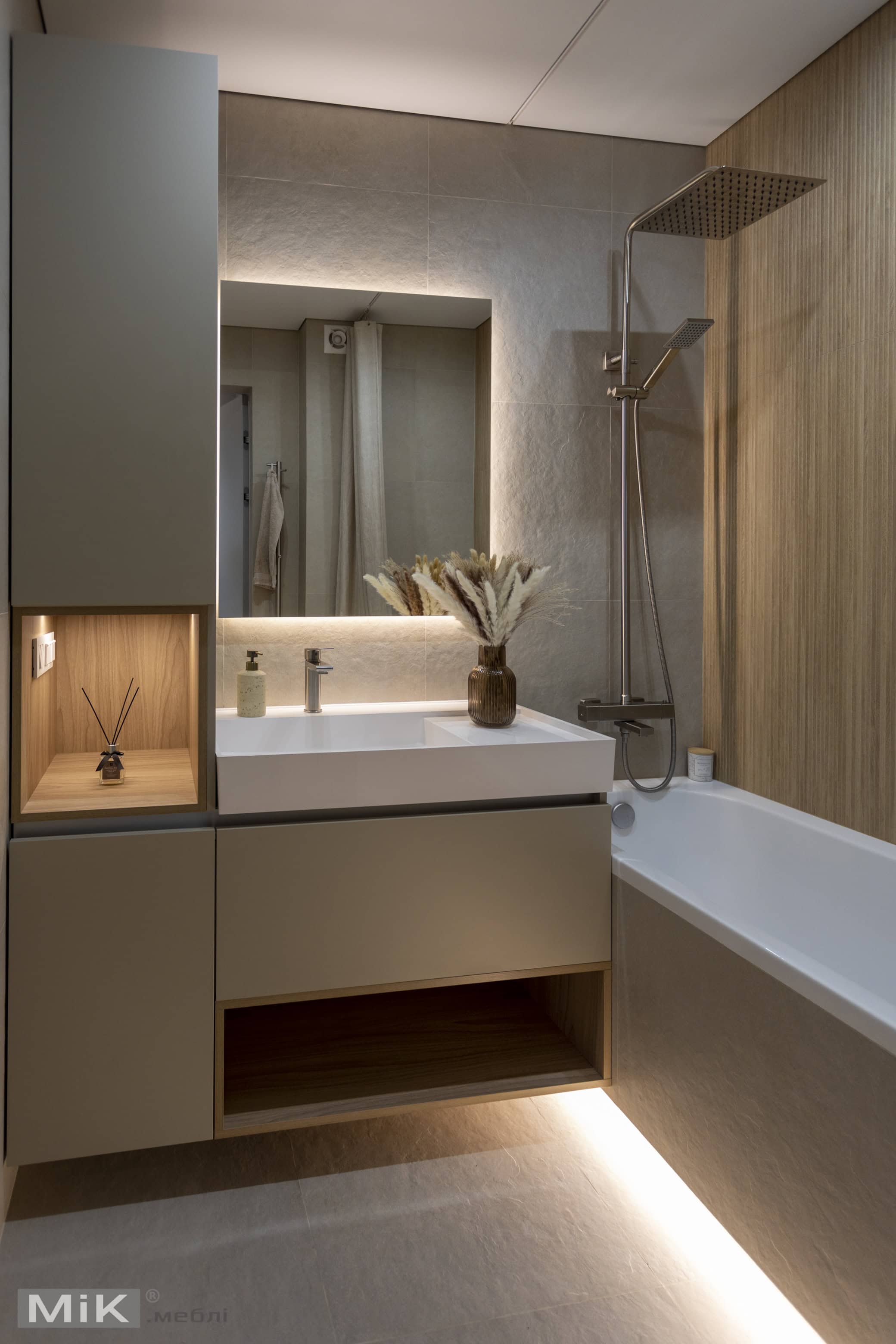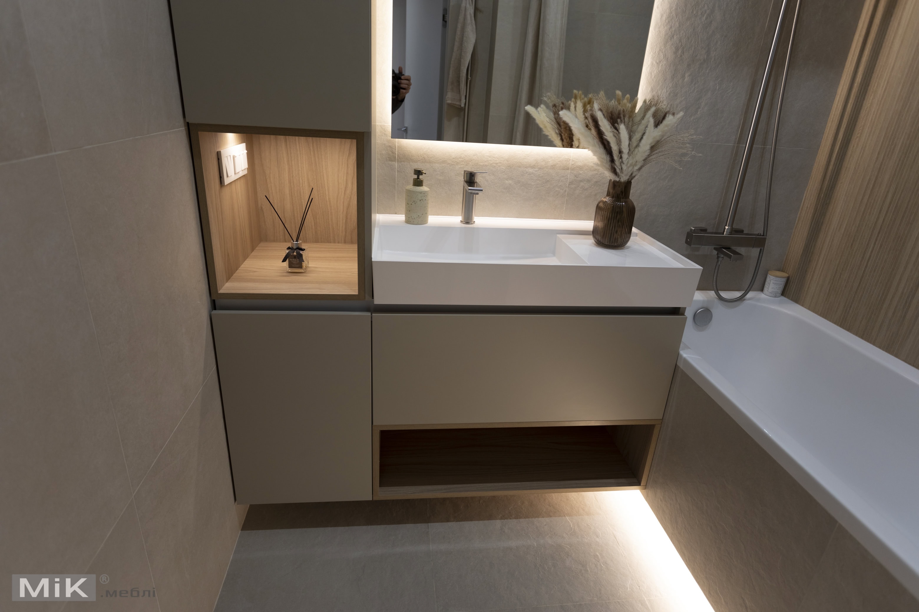 Освітлення: вбудоване LED-підсвічування над дзеркалом та під меблями для створення затишної атмосфери;