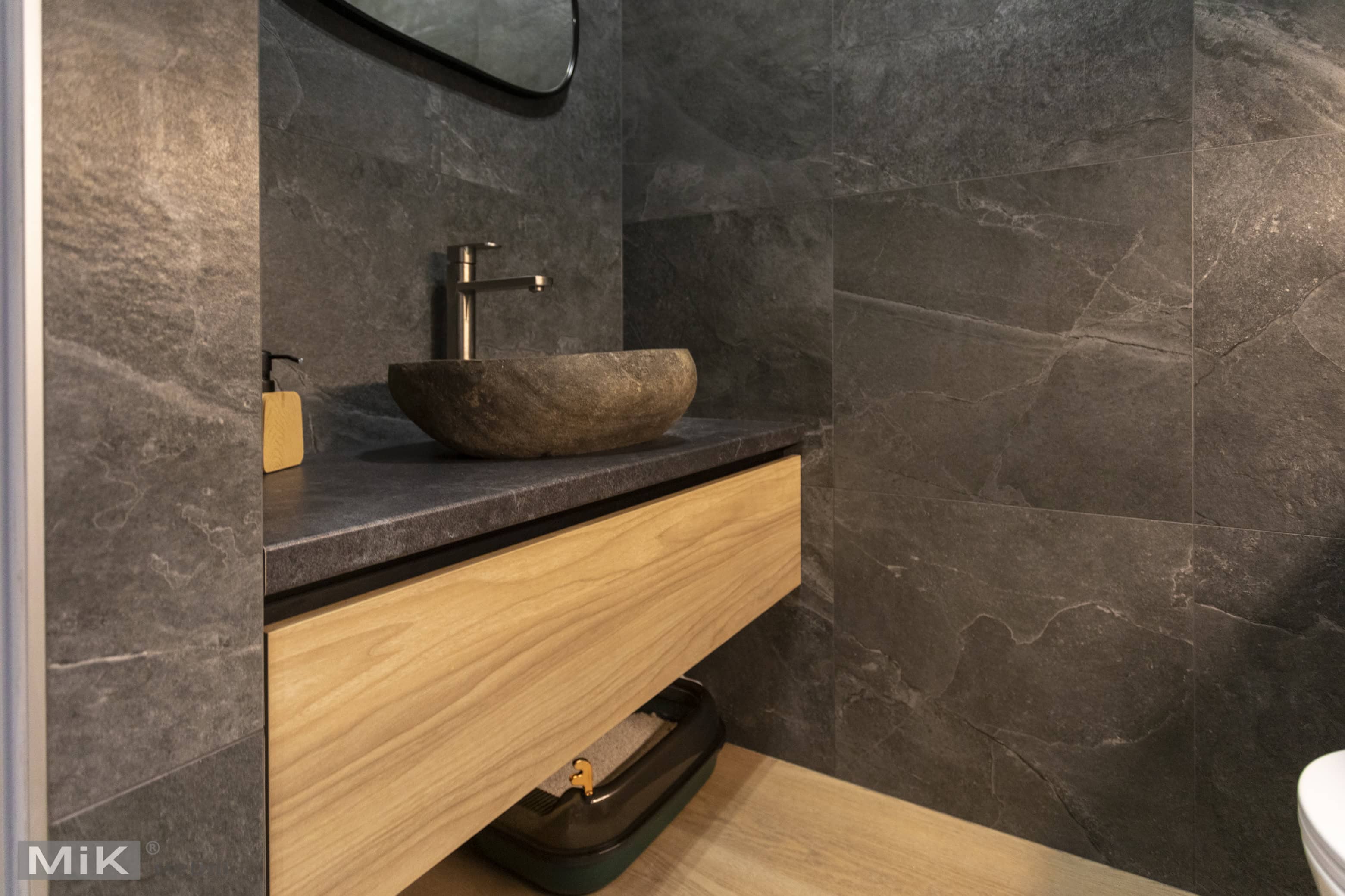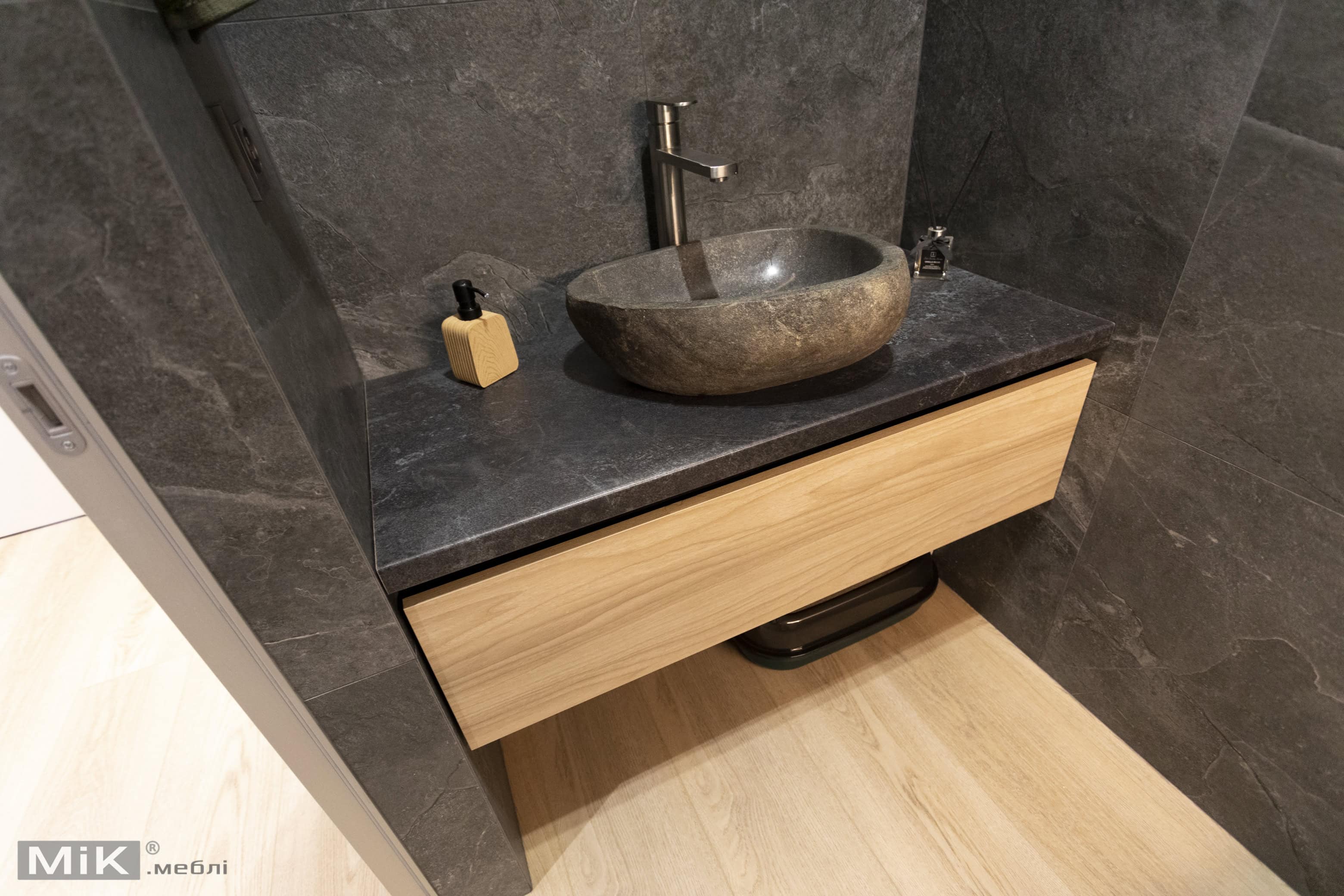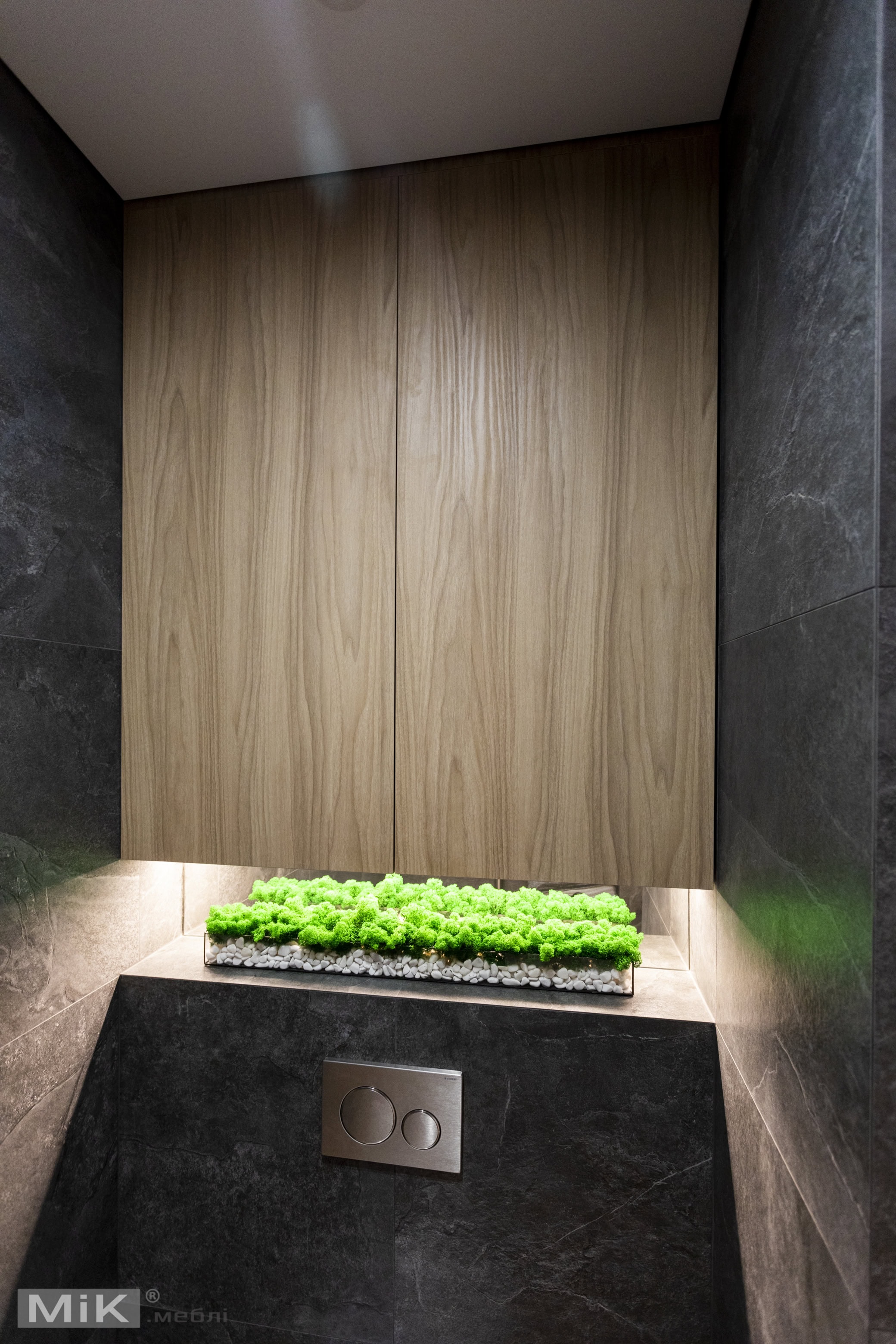 Ця ванна кімната — приклад вдалого поєднання стриманого дизайну, ергономіки та натуральних матеріалів. Меблі виготовлені на замовлення з урахуванням особливостей приміщення, побажань замовника та актуальних дизайнерських трендів.