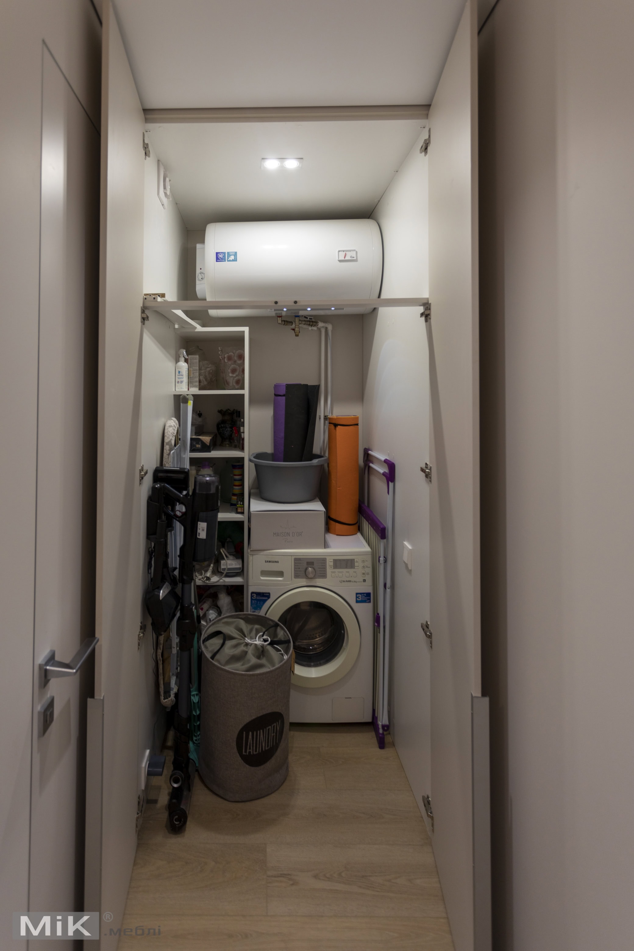 Компактне розміщення: тримачі для швабр, пилососа, кошика для білизни та іншого інвентарю.