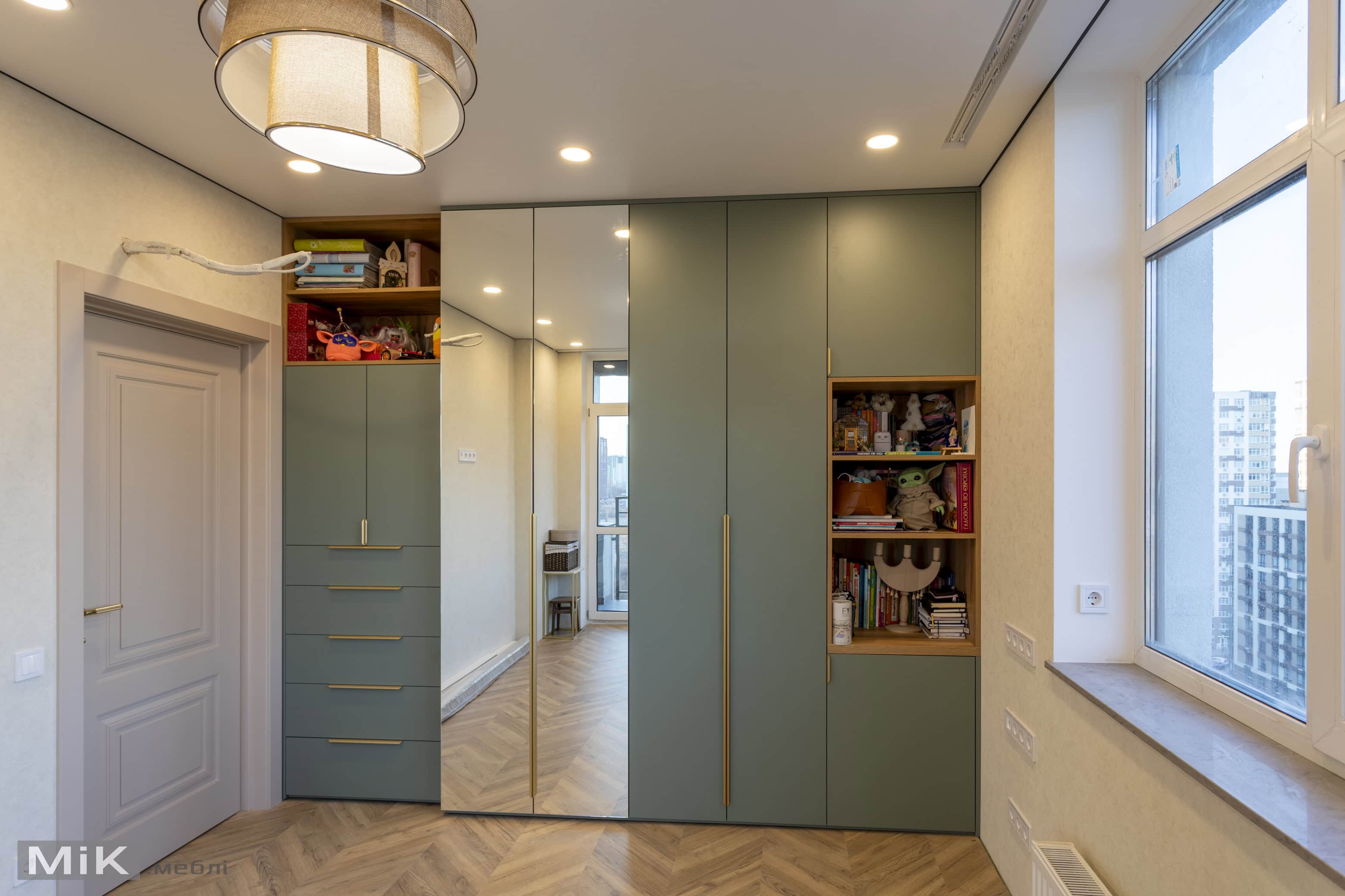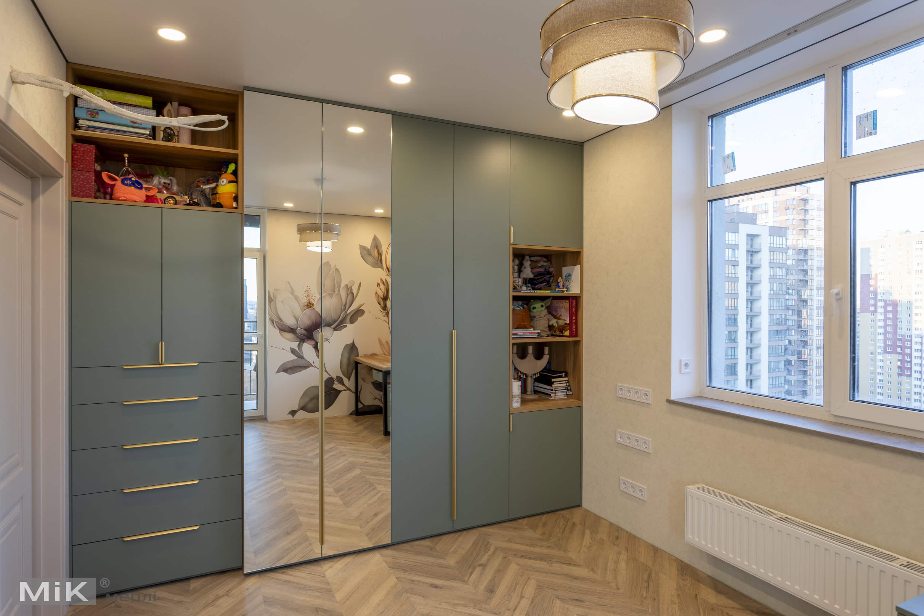 У дитячій кімнаті ми поєднали шафу, робочий стіл біля вікна та тумбу для зберігання в одному спокійному й функціональному рішенні. Світлі фасади, дзеркало та відкрита секція допомогли зробити меблі візуально легкими, а робочу зону — зручною для навчання та щоденного користування.