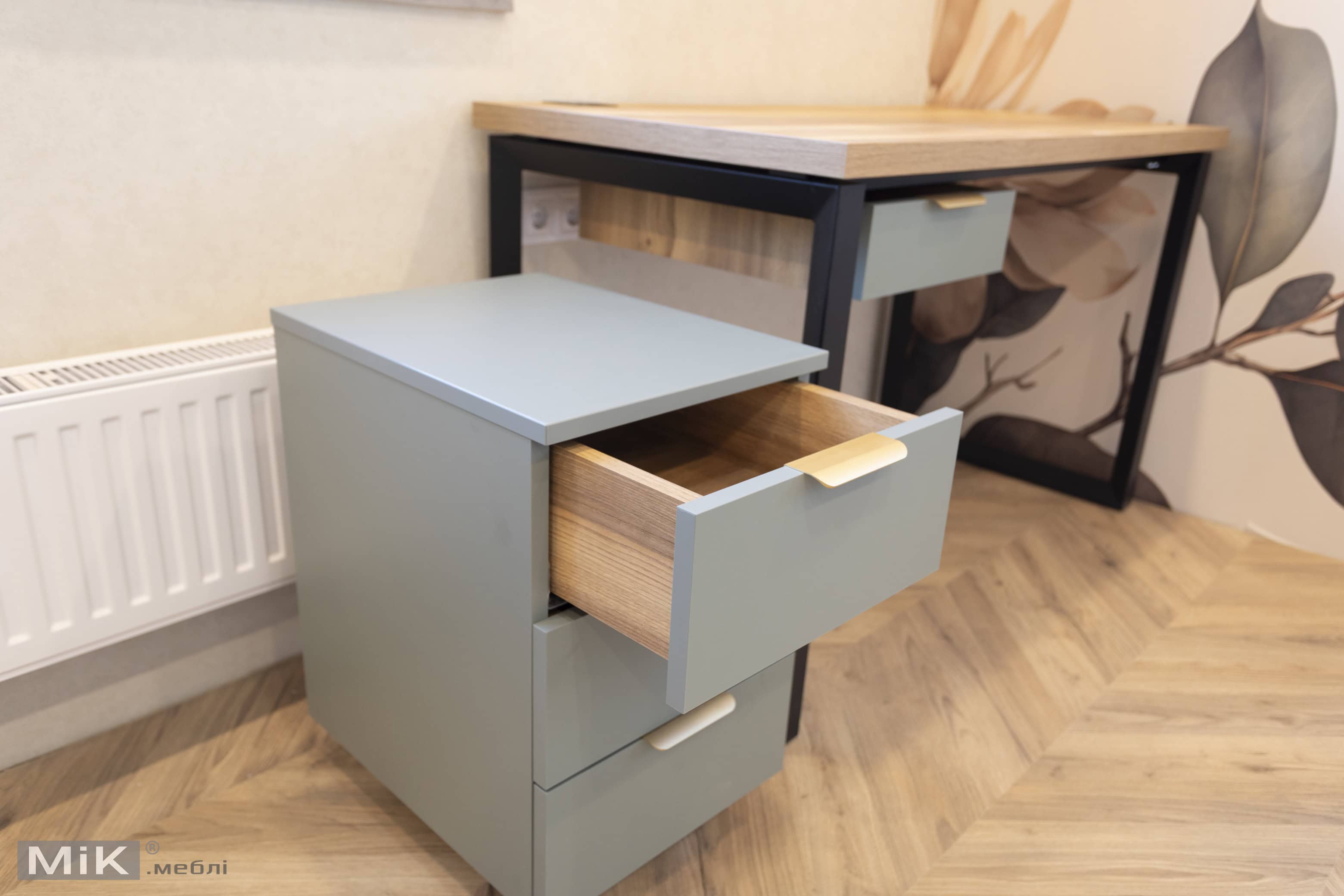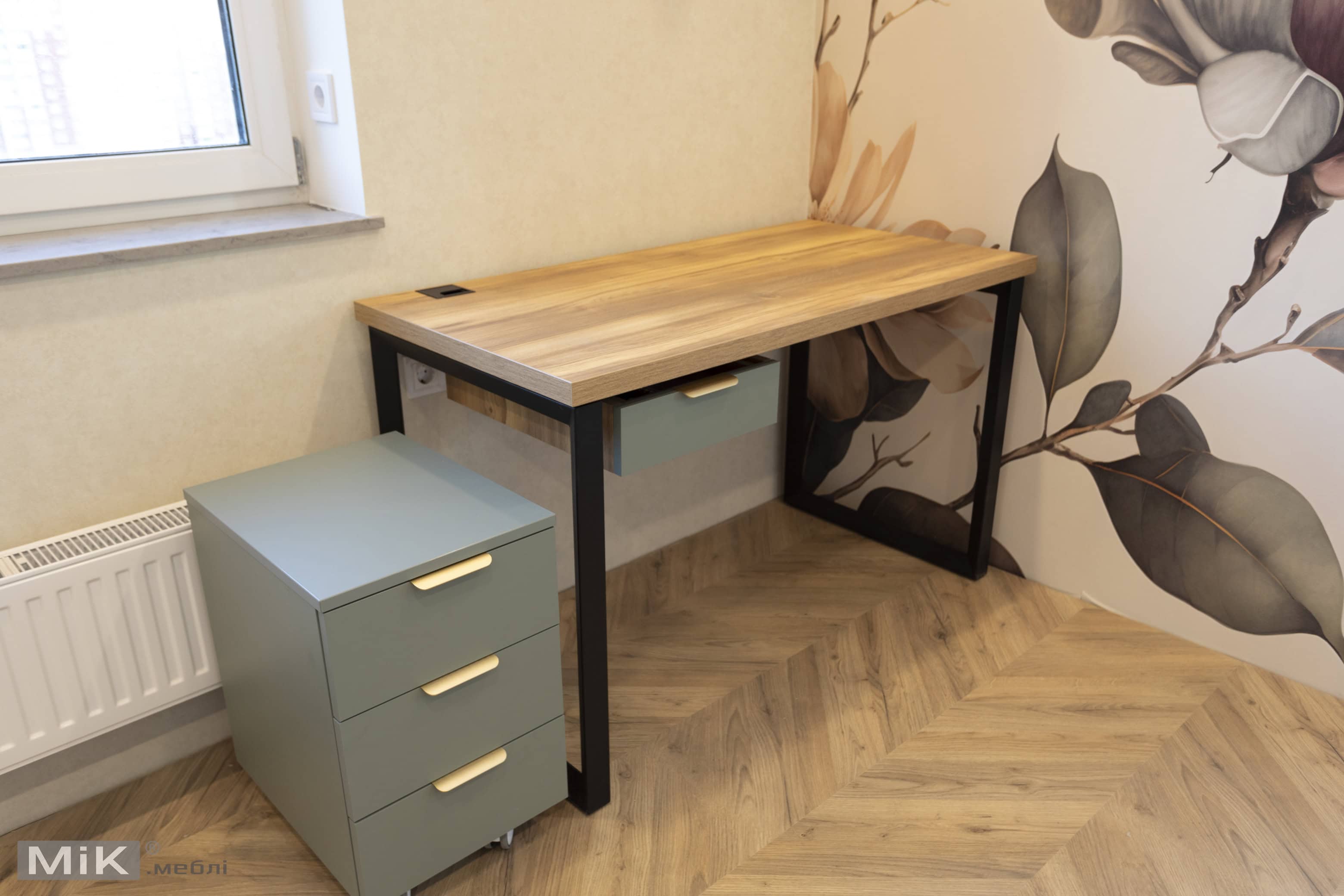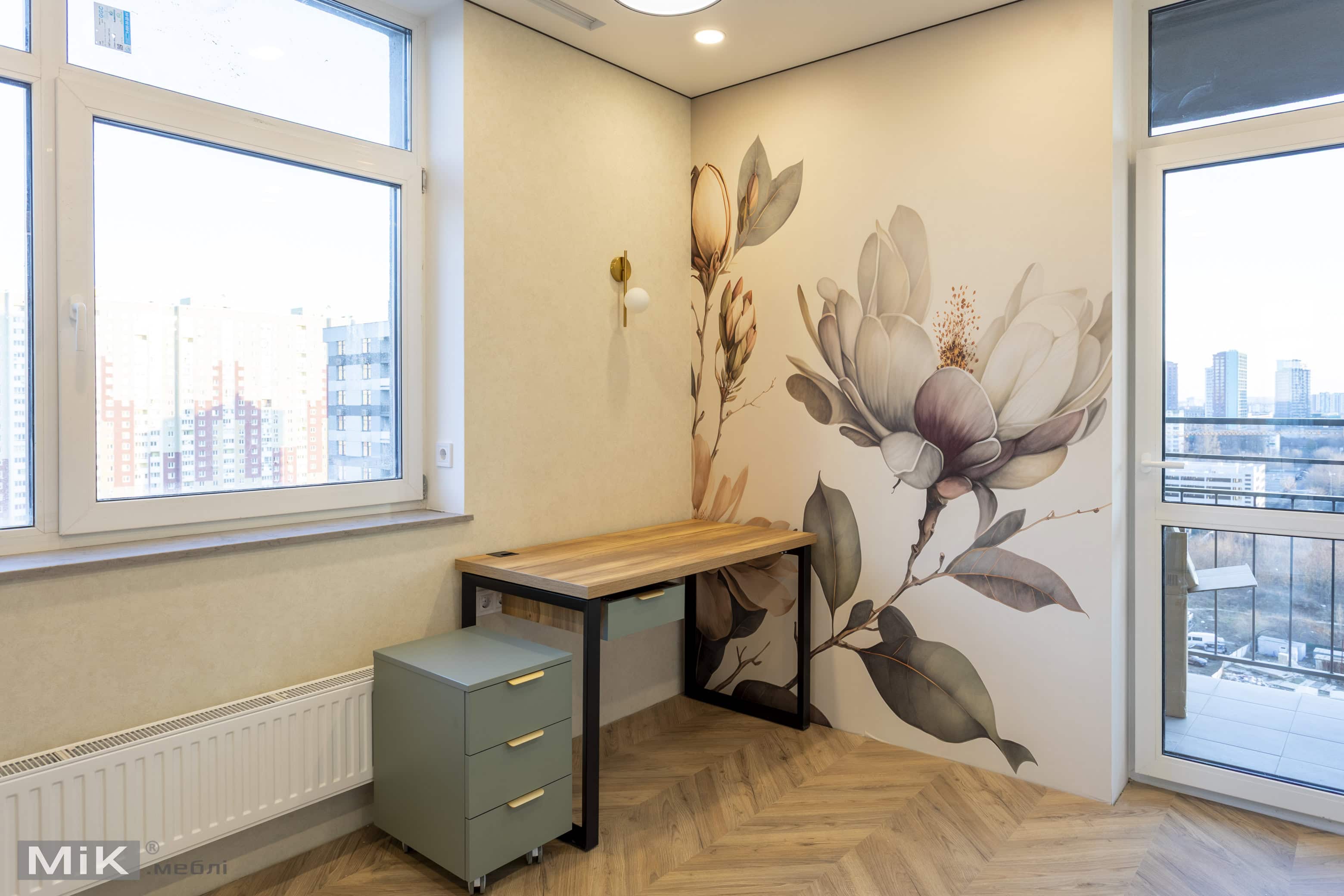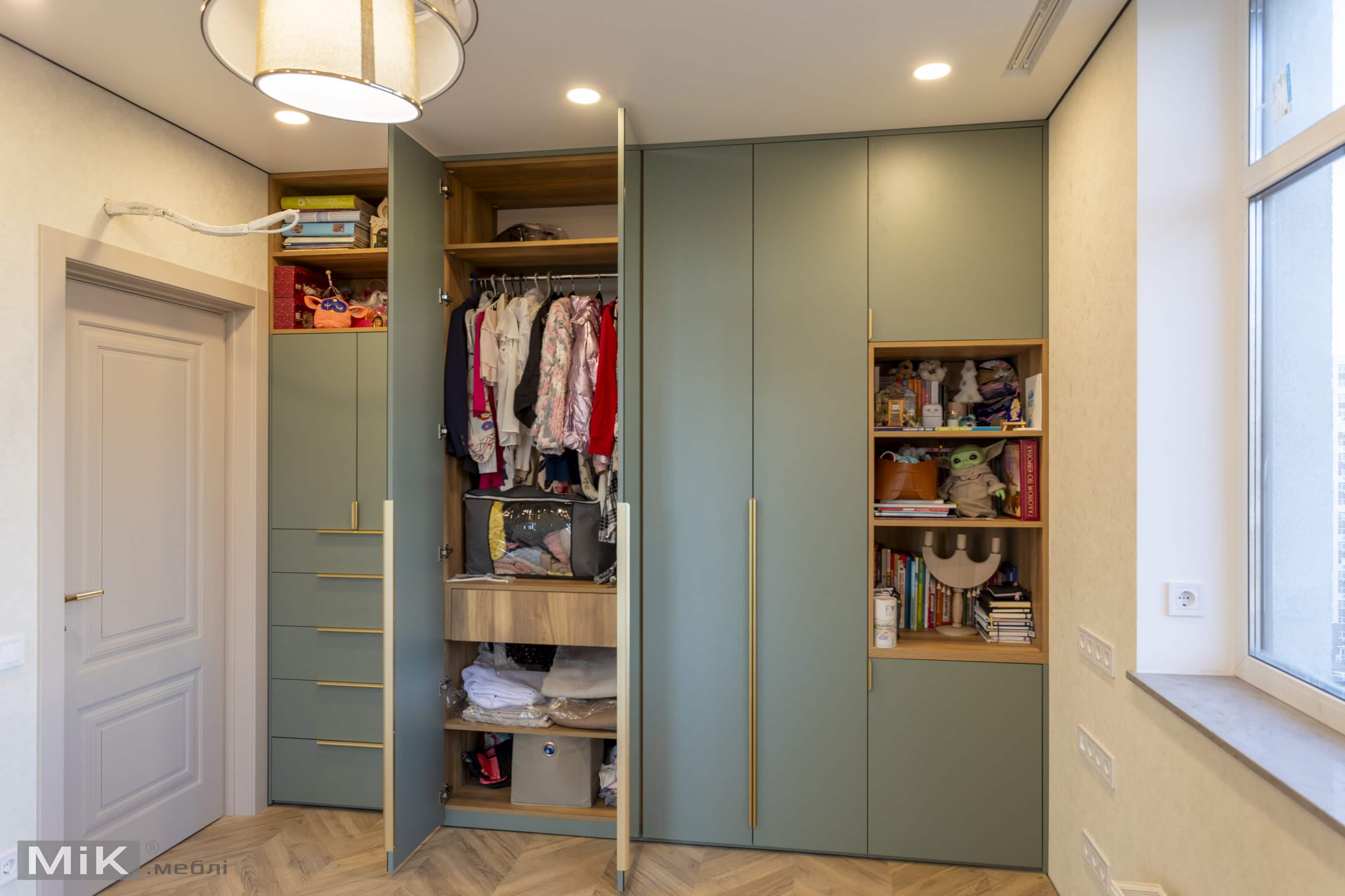 У цьому проєкті для дитячої кімнати ми виготовили шафу, робочу зону біля вікна та тумбу для зберігання. Усі меблі виконані в спокійній кольоровій гамі з урахуванням зручного зберігання, навчання та щоденного користування.