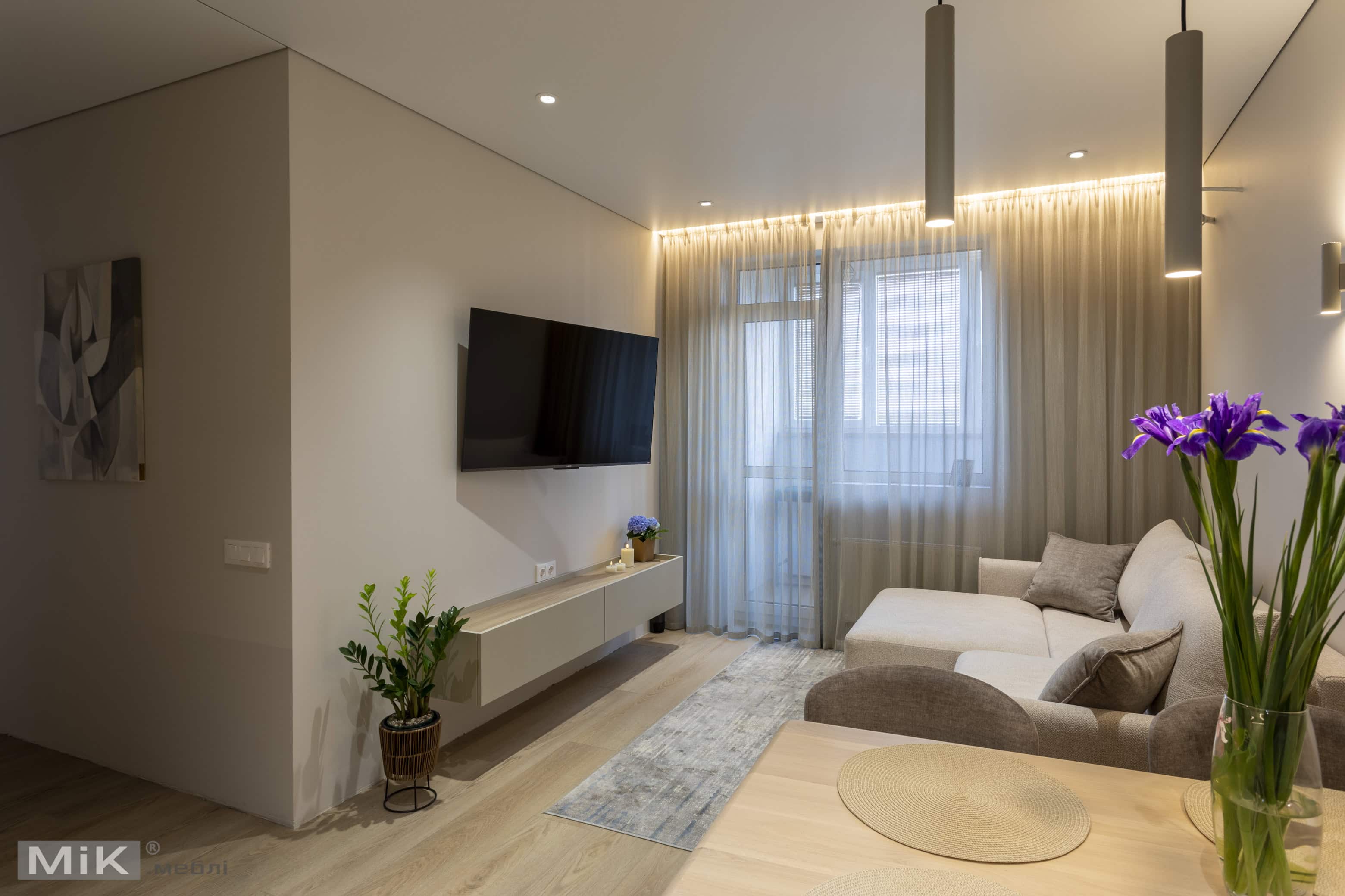 В сочетании с мягким диваном, современным освещением и лёгкими шторами гостиная превратилась в комфортное место для отдыха. Подвесная тумба не только практична, но и подчёркивает стильный минимализм интерьера.