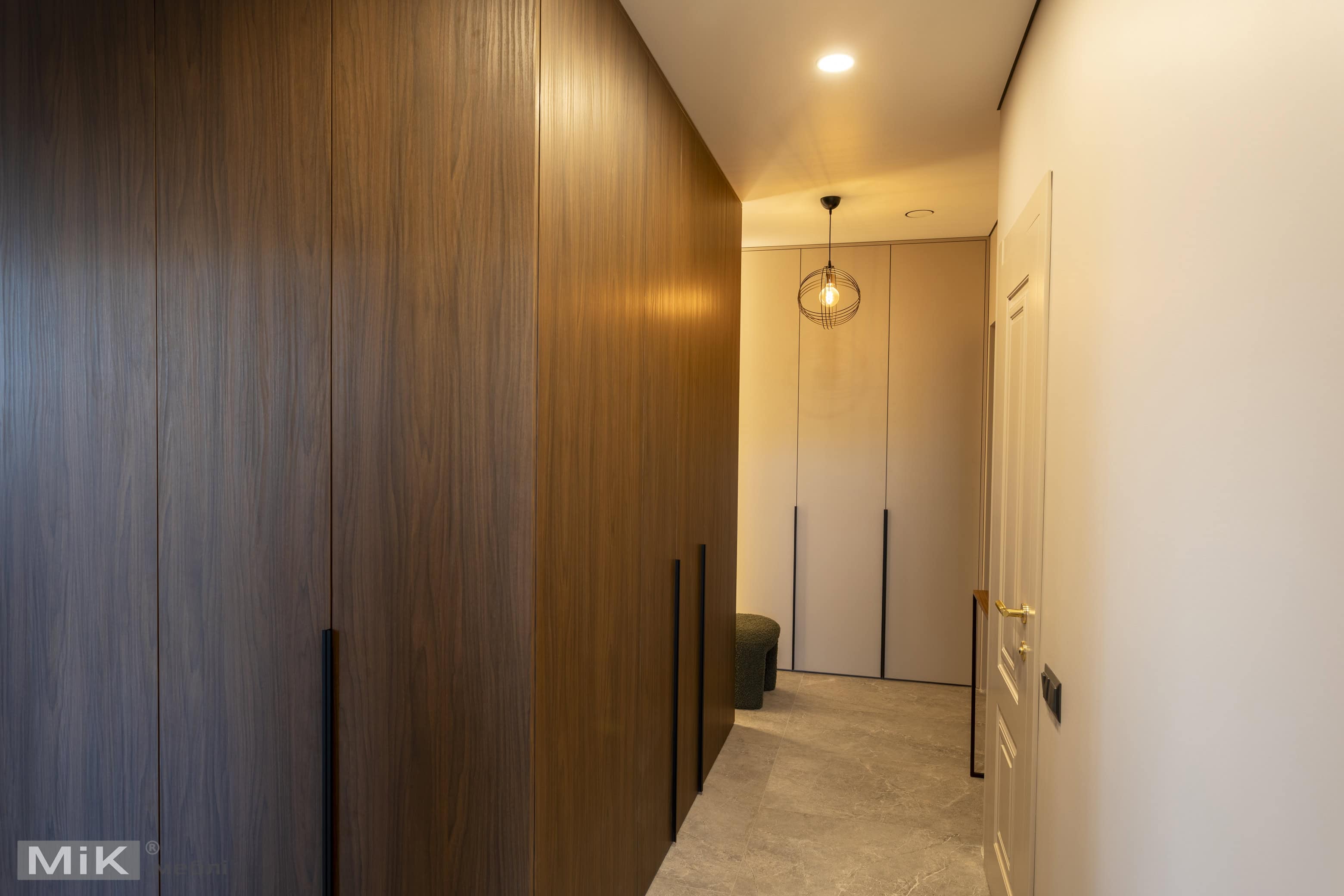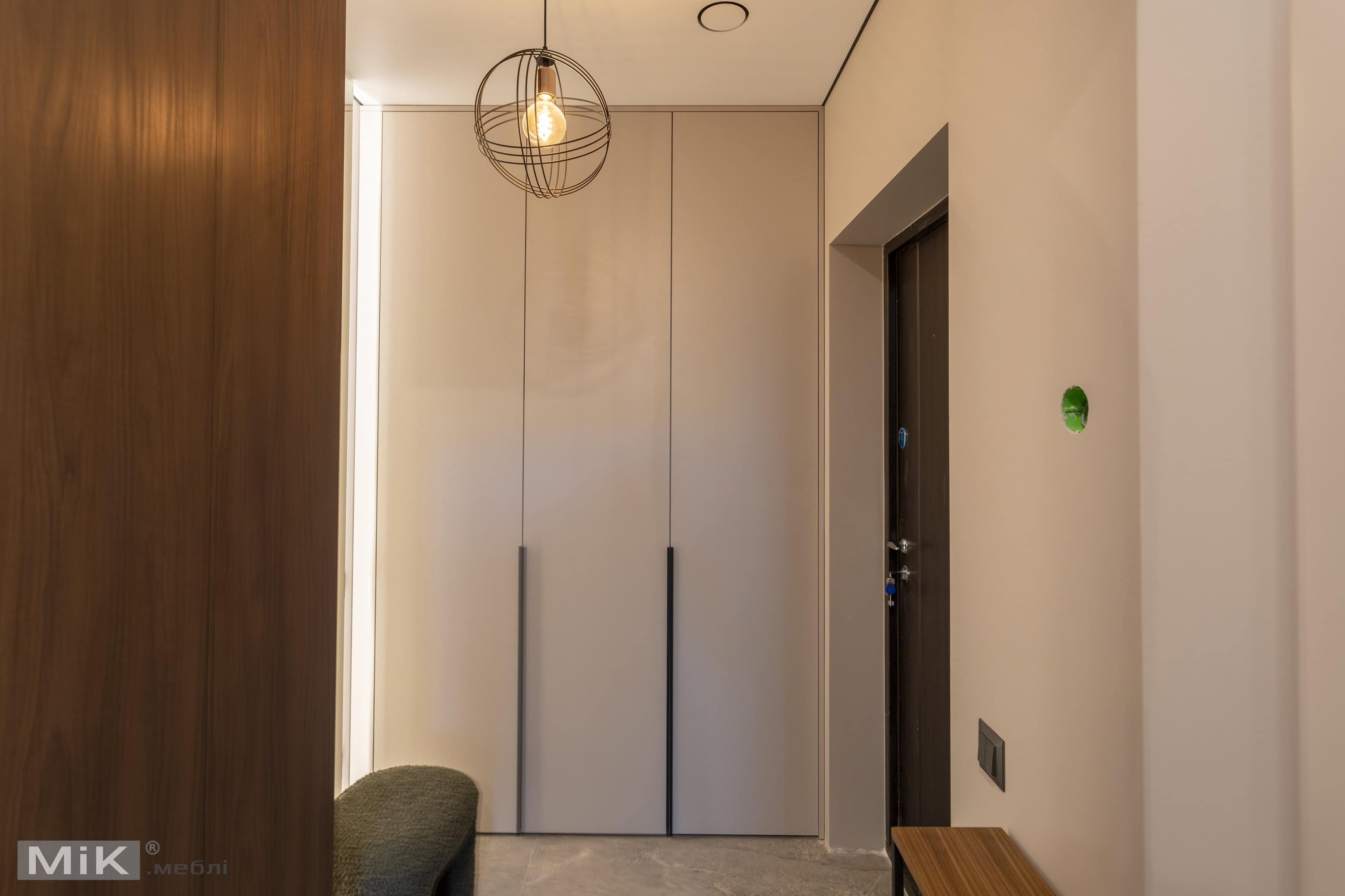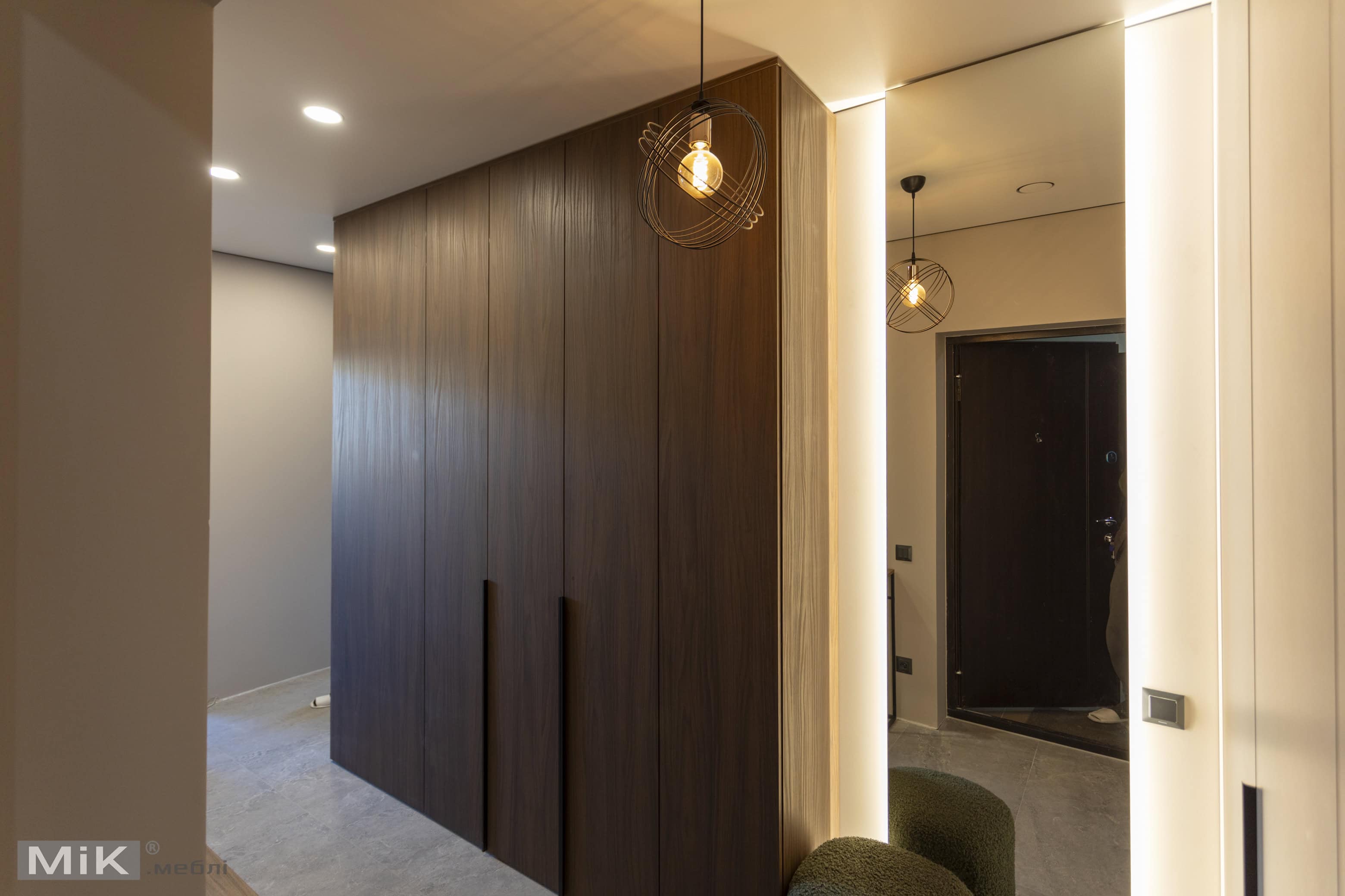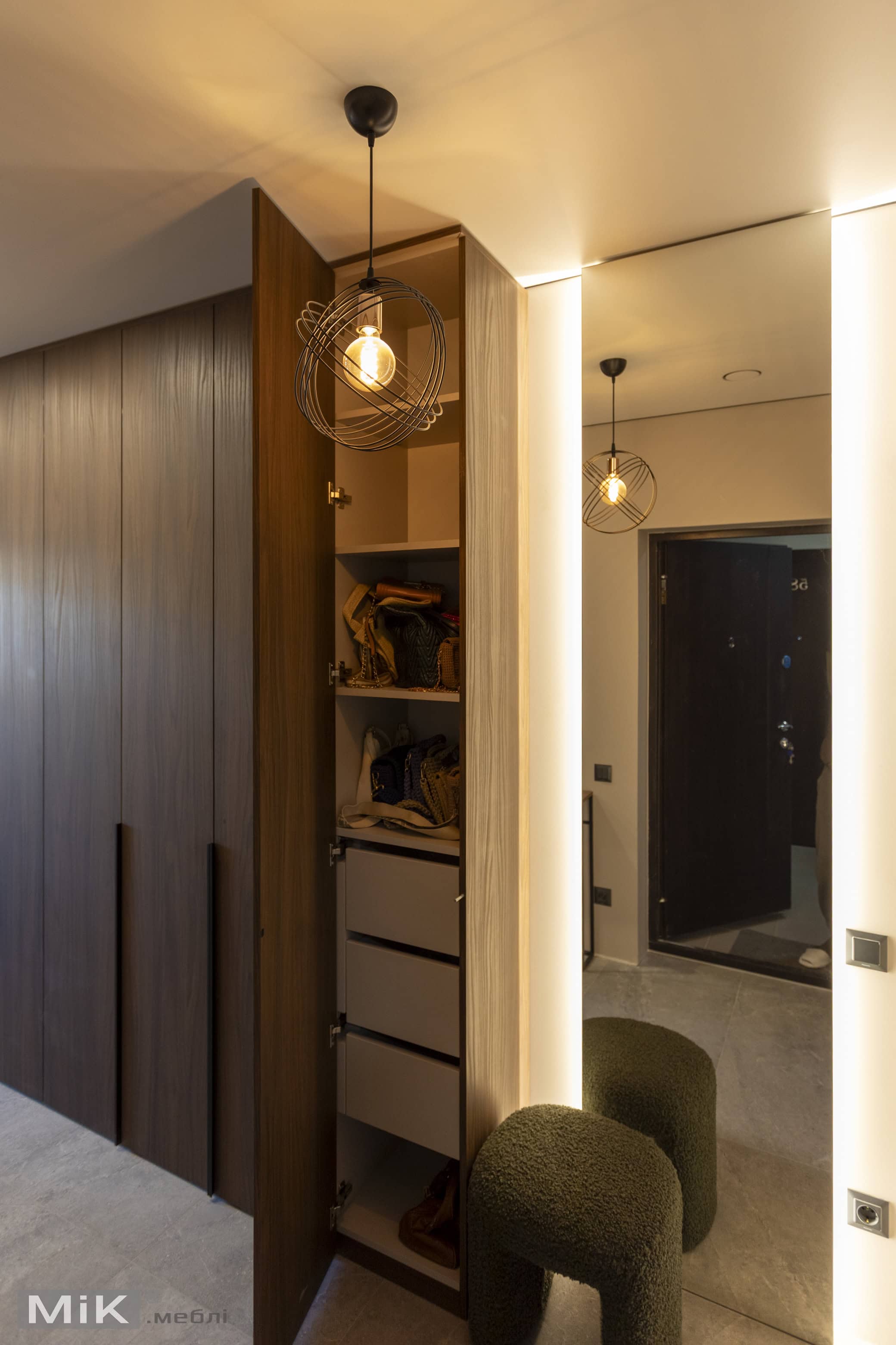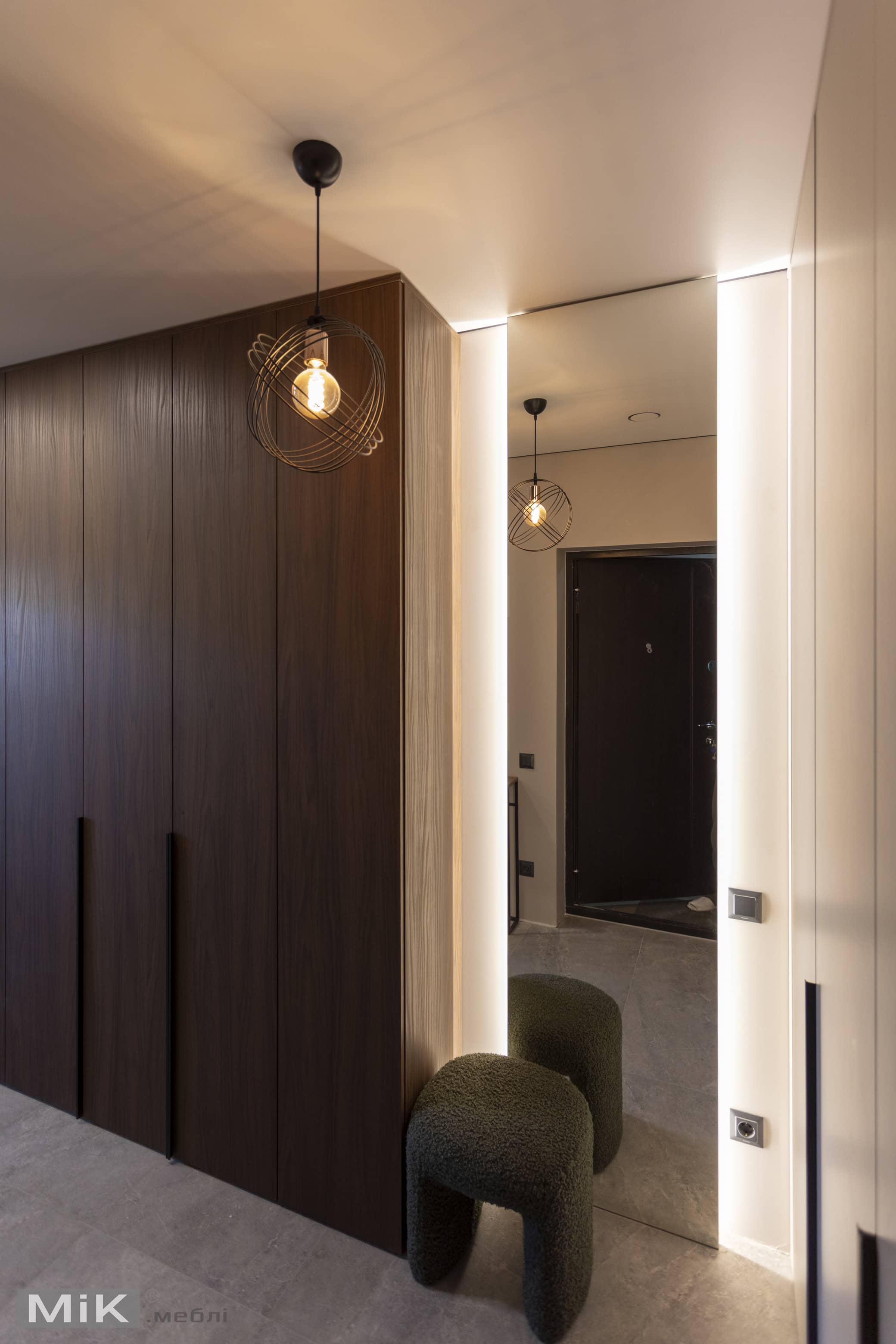 У цьому проєкті ми виготовили шафи для коридору з дзеркалом, підсвіткою та продуманим внутрішнім наповненням. Поєднання закритих фасадів, відкритих секцій і дзеркала допомогло зробити зону зберігання зручною та візуально легкою.